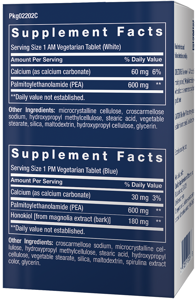 Serving Size 1 AM vegetarian tablet (white) Calcium (as calcium carbonate) 60 mg Palmitoylethanolamide (PEA) 600 mg Other ingredients: microcrystalline cellulose, croscarmellose sodium, hydroxypropyl methylcellulose, stearic acid, vegetable stearate, silica, maltodextrin, hydroxypropyl cellulose, glycerin. Serving Size 1 PM vegetarian tablet (blue) Calcium (as calcium carbonate) 30 mg Palmitoylethanolamide (PEA) 600 mg Honokiol [from magnolia extract (bark)] 180 mg Other ingredients: croscarmellose sodium, microcrystalline cellulose, hydroxypropyl methylcellulose, stearic acid, hydroypropyl cellulose, vegetable stearate, silica, maltodextrin, spirulina extract color, glycerin. Non-GMO The blue PM tablet may cause mild