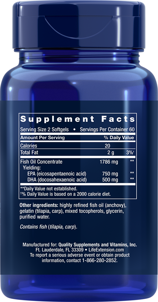 Serving Size 2 softgels Servings Per Container 60 Calories 20 Total Fat 2 g Fish Oil Concentrate 1786 mg Yielding: EPA (eicosapentaenoic acid) 750 mg DHA (docosahexaenoic acid) 500 mg Other ingredients: highly refined fish oil (anchovy), gelatin