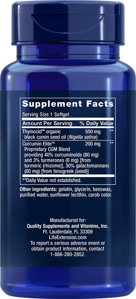 Black Cumin Seed Oil and Curcumin Elite™ from Life Extension® helps you maintain a healthy immune system and promotes a healthy inflammation response with a single, convenient supplement formula. Plus, we’ve recently upgraded our formula to include ultra-bioavailable Curcumin Elite™, which has much better absorption than standard curcumin.