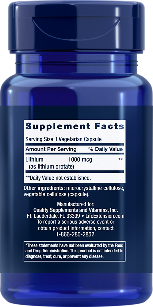 Why Lithium: Research has observed that some people on long-term, high-dose lithium regimens have longer-than-expected telomeres.9 And one study found that lithium levels found in tap water (much lower doses) were modestly associated with human mortality and lifespan.10 There’s also some evidence that lithium may inhibit cellular senescence—a natural part of aging where cells no longer function optimally—as well as help promote healthy circadian rhythms.11,12