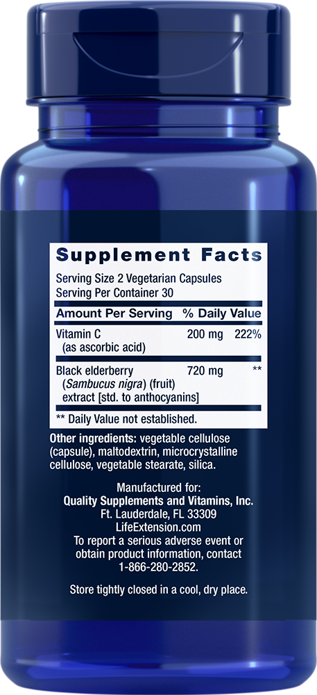 Each two-capsule serving of Black Elderberry + Vitamin C has 720 mg of elderberry extract (Sambucus nigra) standardized to anthocyanins to provide daily support for healthy immune response and respiratory health.