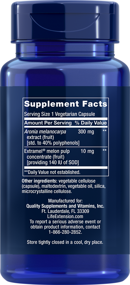 Serving Size 1 vegetarian capsule Servings Per Container 30 Aronia melanocarpa extract (fruit) [std. to 40% polyphenols] 300 mg Extramel® melon pulp