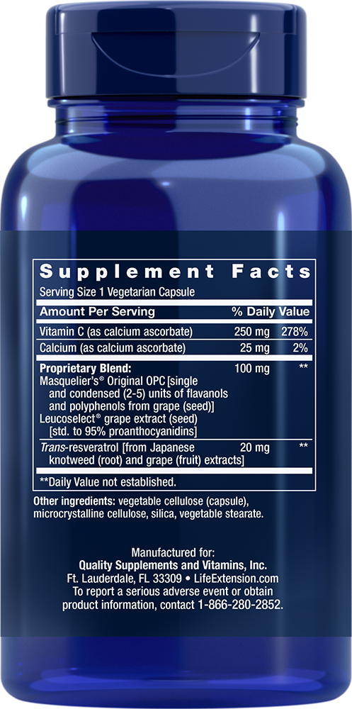 Serving Size 1 vegetarian capsule Vitamin C (as calcium ascorbate) 250 mg Calcium (as calcium ascorbate) 25 mg Proprietary Blend: 100 mg Masquelier’s® Original OPCs [single and condensed (2-5) units of flavanols and polyphenols from grape (seed)] Leucoselect® grape extract (seed) [std. for 95% proanthocyanidins] Trans-Resveratrol [from Japanese knotweed (root) and grape (fruit) extracts] 20 mg Other ingredients: vegetable cellulose (capsule), microcrystalline cellulose, silica, vegetable stearate. Non-GMO