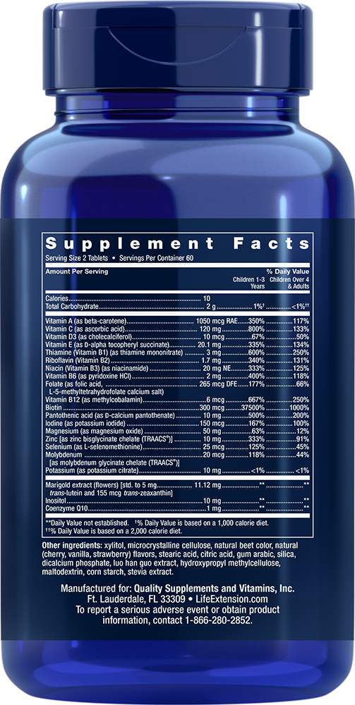 Children's Formula Life Extension Mix™ contains nutrients found in Life Extension Mix™ in amounts suitable for kids four years and older. Each easy-to-chew tablet contains essential minerals and vitamins, including A, D and C, that are important for a child's healthy development and growth.