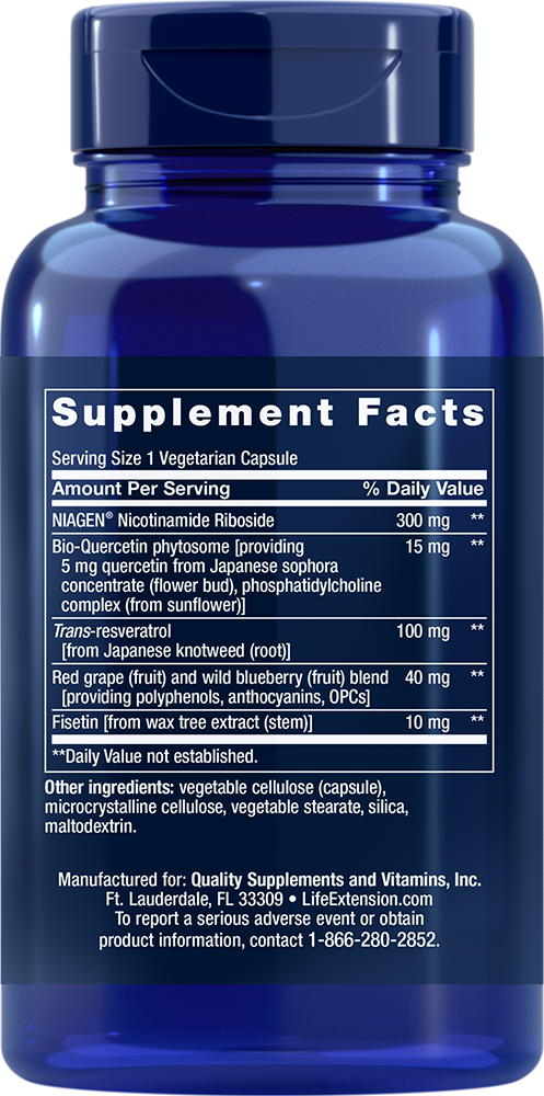 NAD+ Cell Regenerator™ and Resveratrol combines NIAGEN® nicotinamide riboside and resveratrol with quercetin and fisetin to create an innovative nutritional supplement for longevity and youthful cellular energy production. Support healthy cellular metabolism and modulate expression of genes associated with some aspects of aging with Optimized NAD+ Cell Regenerator™ and Resveratrol.