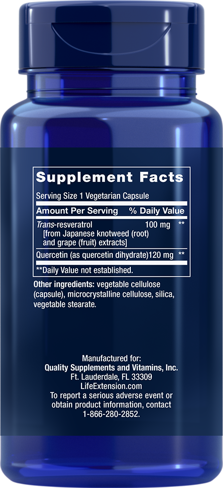 Serving Size 1 vegetarian capsule Trans-Resveratrol [from Japanese knotweed (root) and grape (fruit) 100 mg Quercetin (as quercetin dihydrate) 120 mg Other ingredients: vegetable cellulose (capsule), microcrystalline cellulose, silica, vegetable stearate. Non-GMO