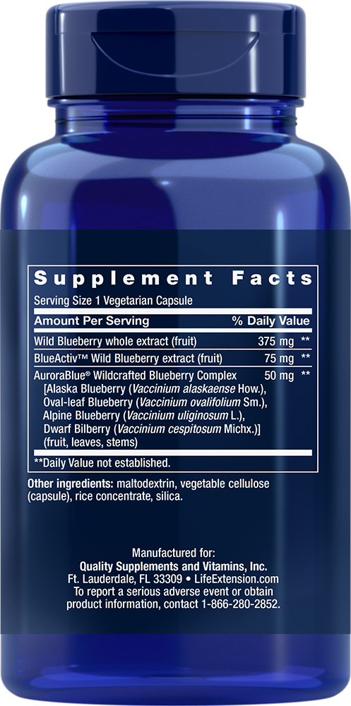 Serving Size 1 vegetarian capsule Wild Blueberry whole extract (fruit) 375 mg BlueActiv™ Wild Blueberry extract (fruit) 75 mg AuroraBlue® Wildcrafted Blueberry Complex [Alaska Blueberry (Vaccinium alaskaense How.), Oval-leaf Blueberry (Vaccinium ovalifolium Sm.), Alpine Blueberry (Vaccinium uliginosum L.), Dwarf Bilberry (Vaccinium