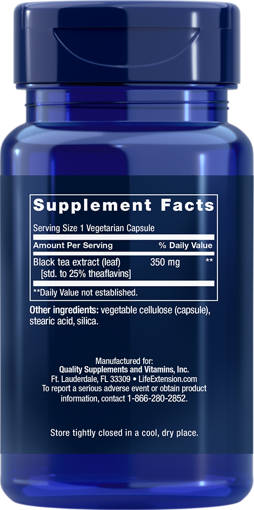 Serving Size 1 vegetarian capsule Black tea extract (leaf) [std. to 25% theaflavins] 350 mg Other ingredients: vegetable cellulose (capsule), stearic acid, silica. Non-GMO This product contains a black tea extract which is licensed from Applied Food Sciences, Inc. and is protected by U.S. patent Nos. 6,811,799 and 6,602,527.