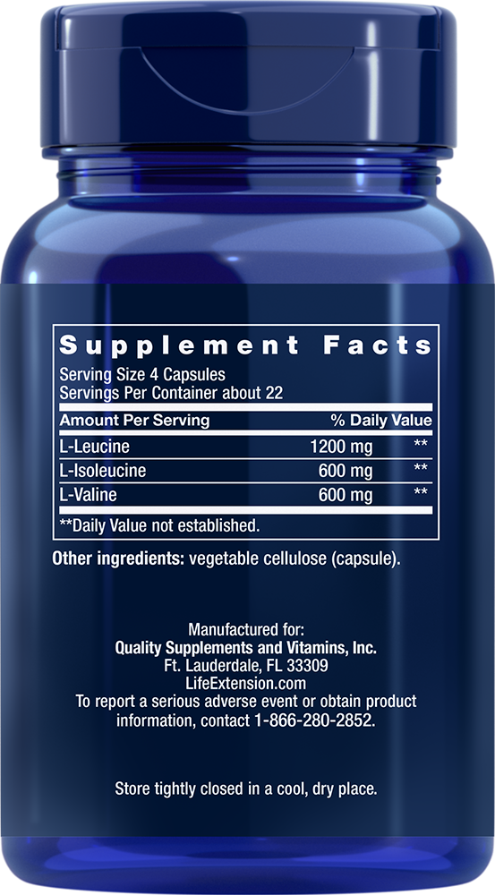 Serving Size 4 capsules Servings Per Container about 22 L-Leucine 1200 mg L-Isoleucine 600 mg L-Valine 600 mg Other ingredients: vegetable cellulose (capsule). Individuals with ALS or disorders impairing the metabolism of branched chain amino acids should not use this product.