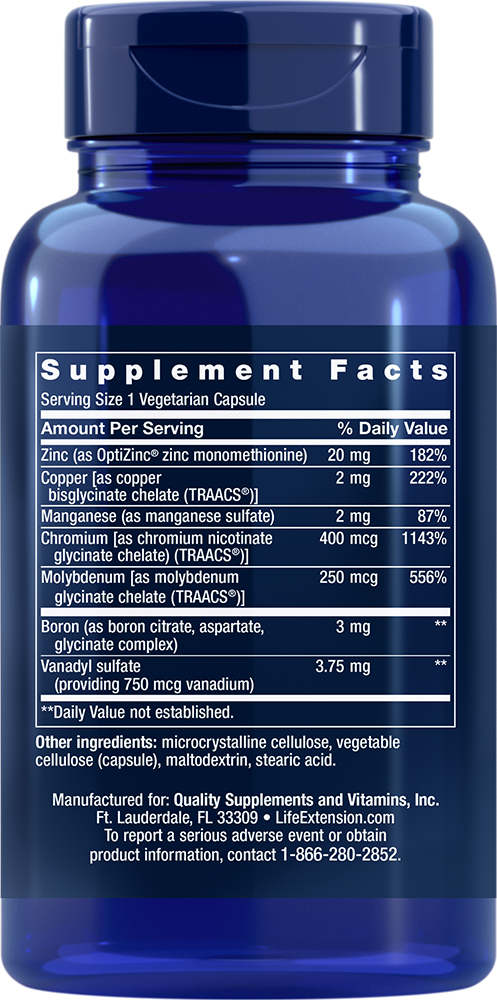 Serving Size 1 vegetarian capsule Zinc (as OptiZinc® zinc monomethionine) 20 mg Copper [as copper bisglycinate chelate (TRAACS®)] 2 mg Manganese (as manganese sulfate) 2 mg Chromium [as chromium nicotinate glycinate chelate) (TRAACS®)] 400 mcg Molybdenum [as molybdenum glycinate chelate (TRAACS®)] 250 mcg Boron (as boron citrate, aspartate, glycinate complex) 3 mg Vanadyl sulfate (providing 750 mcg vanadium) 3.75 mg Other ingredients: microcrystalline cellulose, vegetable cellulose (capsule), maltodextrin, stearic acid. Non-GMO OptiZinc® is a registered trademark of InterHealth Nutritionals, Inc.