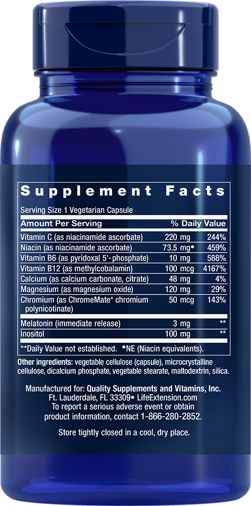 Serving Size 1 vegetarian capsule Vitamin C (as niacinamide ascorbate) 220 mg Niacin (as niacinamide ascorbate) 73.5 mg• Vitamin B6 (as pyridoxal 5' phosphate) 10 mg Vitamin B12 (as methylcobalamin) 100 mcg Calcium (as calcium carbonate, citrate) 48 mg Magnesium (as magnesium oxide) 120 mg Chromium (as ChromeMate® chromium polynicotinate) 50 mcg Melatonin (immediate release) 3 mg Inositol 100 mg Other ingredients: vegetable cellulose (capsule), microcrystalline cellulose, dicalcium phosphate, vegetable stearate, maltodextrin, silica. Non-GMO •NE (Niacin equivalents) ChromeMate® is a registered trademark of Interhealth Nutritionals, Inc. Do not consume alcohol, drive or operate machinery after taking this product.