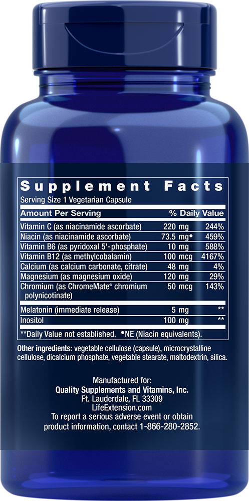 Serving Size 1 vegetarian capsule Vitamin C (as niacinamide ascorbate) 220 mg Niacin (as niacinamide ascorbate) 73.5 mg Vitamin B6 (as pyridoxal 5'-phosphate) 10 mg Vitamin B12 (as methylcobalamin) 100 mcg Calcium (as calcium carbonate, citrate) 48 mg Magnesium (as magnesium oxide) 120 mg Chromium (as ChromeMate® chromium polynicotinate) 50 mcg Melatonin (immediate release) 5 mg Inositol 100 mg Other ingredients: vegetable cellulose (capsule), dicalcium phosphate, microcrystalline cellulose, vegetable stearate, maltodextrin, silica. Non-GMO ChromeMate® is a registered trademark of Interhealth Nutritionals, Inc. ChromeMate® brand niacin-bound chromium. Do not consume alcohol, drive or operate machinery after taking this product.