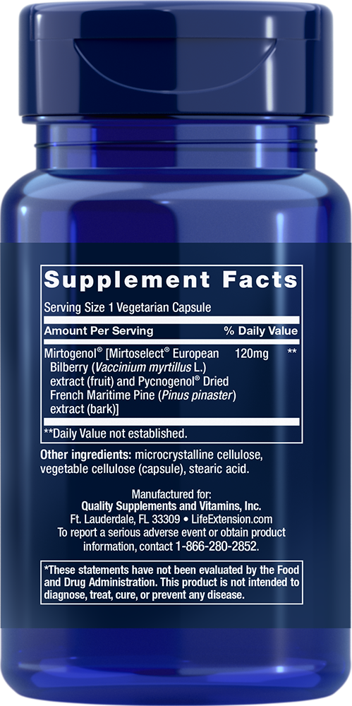 The powerful blend of ingredients in Mirtogenol®, which is already used in Europe, includes Mirtoselect® European bilberry plant extract and Pycnogenol® French maritime pine bark extract.