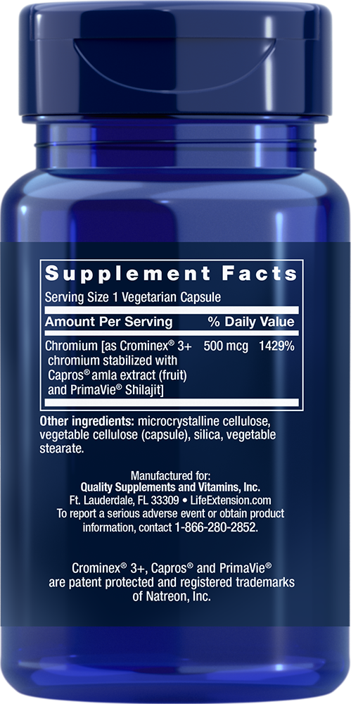 Serving Size 1 vegetarian capsule Chromium [as Crominex® 3+ chromium stabilized with Capros® amla extract (fruit) and PrimaVie® Shilajit] 500 mcg Other ingredients: microcrystalline cellulose, vegetable cellulose (capsule), silica, vegetable stearate. Crominex® 3+, Capros®, and Primavie® are patent protected and registered trademarks of Natreon, Inc. If you are taking blood glucose lowering medication, consult your healthcare provider before taking this product.