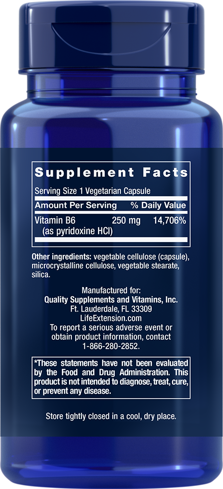 Serving Size 1 vegetarian capsule Vitamin B6 (as pyridoxine HCl) 250 mg Other ingredients: vegetable cellulose (capsule), microcrystalline cellulose, vegetable stearate, silica. Some people have reported temporary symptoms of peripheral neuropathy (tingling, numbness sensation,