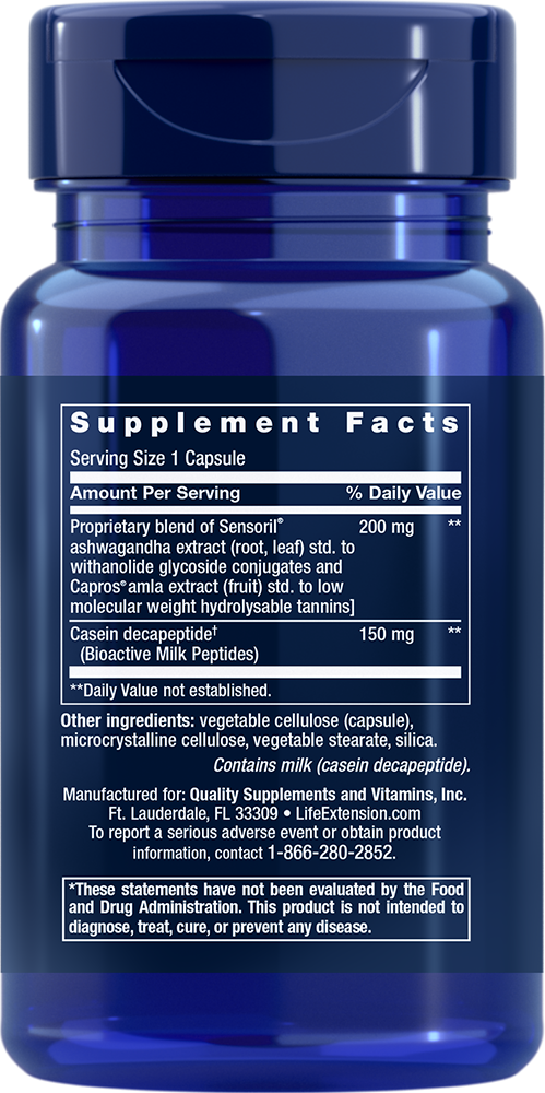 Serving Size 1 vegetarian capsule Proprietary blend of Sensoril® ashwagandha extract (root, leaf) std. to withanolide glycoside conjugates and Capros® amla extract (fruit) std. to low molecular weight hydrolysable tannins 200 mg Casein decapeptide† (Bioactive Milk Peptides) 150 mg Other ingredients: vegetable cellulose (capsule), microcrystalline cellulose,silica, vegetable stearate. Contains milk (casein decapeptide). Sensoril® and Capros® are patent protected and registered trademarks of Natreon, Inc.