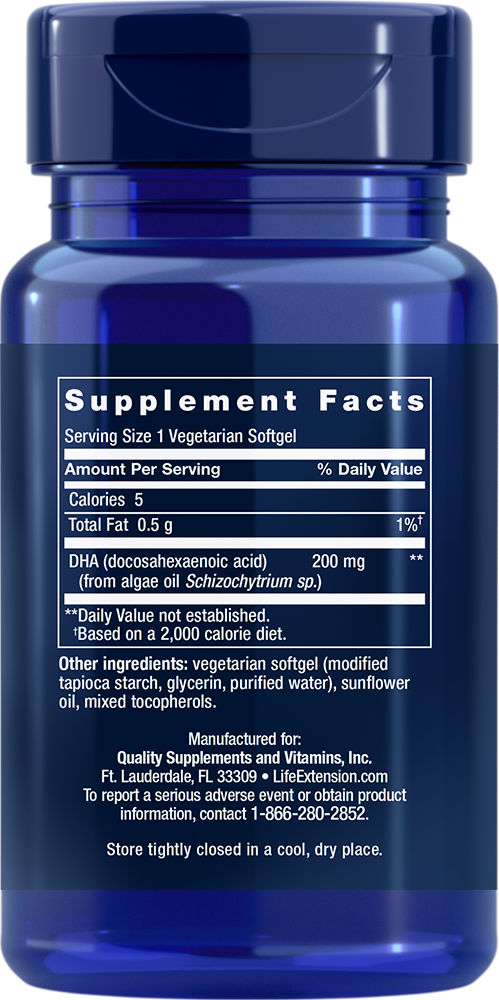 Scientific research has found that the proportions of DHA in body tissue are substantially lower in vegans and vegetarians compared to people who regularly eat animal-sourced foods.10 So, Life Extension developed a DHA formulation derived from sustainable algae sources. Made with a highly refined DHA oil derived entirely from algae cells in culture, it meets the most rigid standards of vegan and vegetarian diets—but is also ideal for virtually everyone who wishes to supplement their DHA intake.