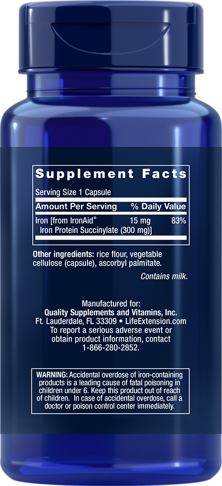 Serving Size 1 vegetarian capsule Iron [from IronAid® Iron Protein Succinylate (300 mg)] 15 mg Other ingredients: vegetable cellulose (capsule), microcrystalline cellulose, silica, stearic acid. Contains milk. IronAid® is a registered trademark of Chemi Nutra, U.S. Trademark Reg. No. 2680178. Do not take this product unless you are truly deficient in iron. Excess iron may cause increased oxidation leading to inflammation. Warning: Accidental overdose of iron-containing products is a leading cause of fatal poisoning in children under 6. Keep this product out of reach of children. In case of accidental overdose, call a doctor or poison control center immediately.