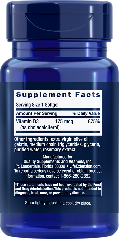 This vitamin D3 supplement delivers 175 mcg (7,000 IU) of vitamin D3 as cholecalciferol per softgel. We suggest that you take a 25-hydroxy vitamin D blood test after 3 months to assess and adjust your dosage. Your optimal blood levels should be 50–80 ng/ml year-round.