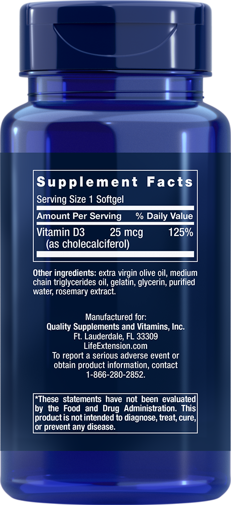 This vitamin D3 supplement delivers 25 mcg (1,000 IU) of vitamin D3 as cholecalciferol per softgel. We suggest that you take a 25-hydroxy vitamin D blood test after 3 months to assess and adjust your dosage. Your optimal blood levels should be 50–80 ng/ml year-round.