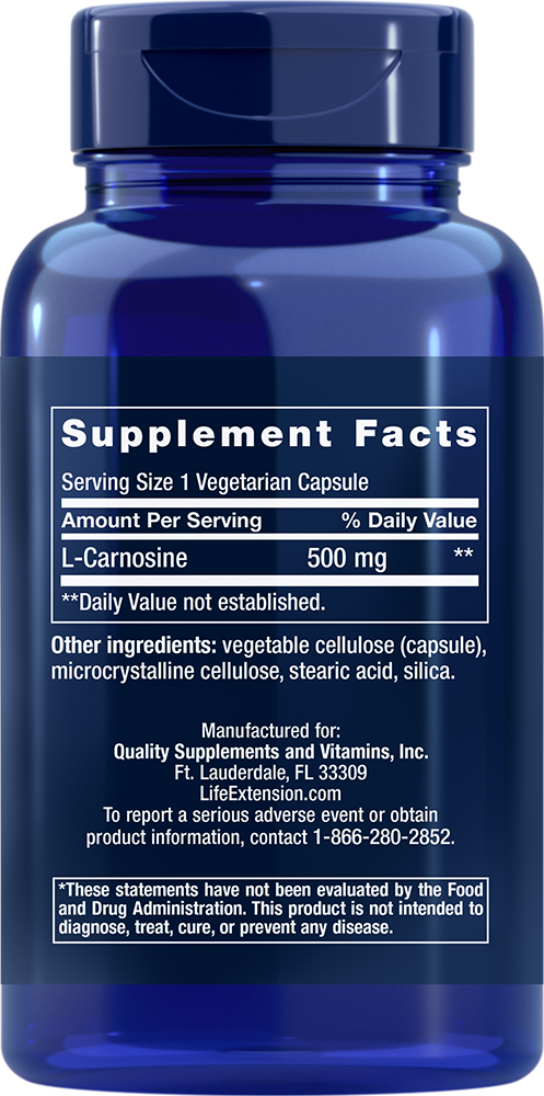 Serving Size 1 vegetarian capsule L-Carnosine 500 mg Other ingredients: vegetable cellulose (capsule), microcrystalline cellulose, stearic acid, silica. Non-GMO