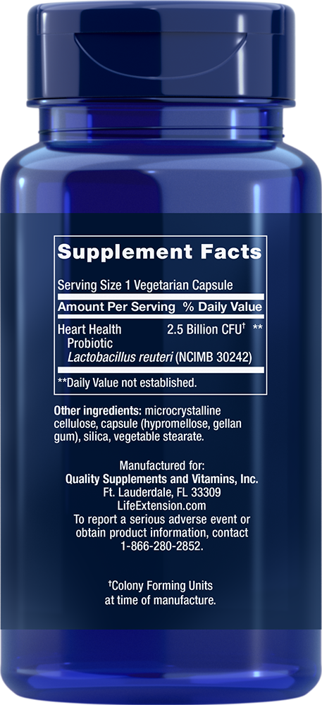 Serving Size 1 vegetarian capsule Heart Health Probiotic 74 mg Other ingredients: microcrystalline cellulose, capsule (hypromellose, gellan gum), silica, vegetable stearate. †Colony Forming Units at time of manufacture. Non-GMO