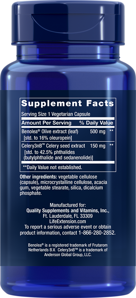 Serving Size 1 vegetarian capsule Benolea® Olive extract (leaf) 500 mg Celery3nBTM Celery seed extract 150 mg Other ingredients: vegetable cellulose (capsule), microcrystalline cellulose, acacia gum, vegetable stearate, silica, dicalcium phosphate. Non-GMO Benolea® is a registered trademark of Frutarom Netherlands B.V.