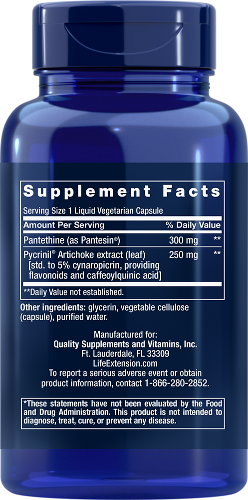 Serving Size 1 liquid vegetarian capsule Pantethine (as Pantesin®) 300 mg Pycrinil® Artichoke extract (leaf) [std. to 5% cynaropicrin (12.5 mg) and providing flavonoids and caffeoylquinic acid] 250 mg Other ingredients: glycerin, vegetable cellulose (capsule), purified water. Non-GMO Pycrinil® is a registered trademark of Indena S.p.A., Italy. If you have gallstones or a biliary tract obstruction, do not use this product.