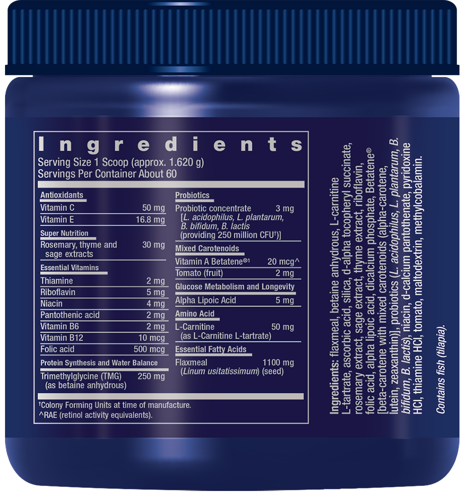 Our Dog Mix helps protect and maintain your pet’s health. Just two scoops per day provide the vitamins your pet needs to stay healthy and strong. Dog Mix contains significant amounts of high-grade nutrients usually reserved for the most expensive human supplements. It contains flavonoids, amino acids, antioxidants, essential fatty acids, methylation enhancers and more. Research in dogs shows supplements with various combinations of similar nutrients promote healthy brain and kidney function and support physical fitness.5,6 In addition, Dog Mix contains probiotics to enhance intestinal, metabolic and immune health.7,8