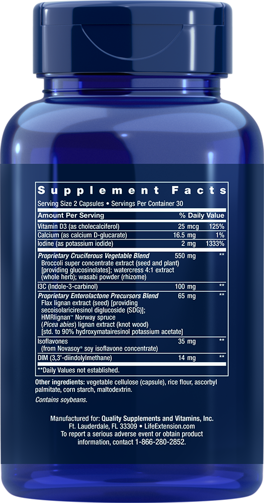 Serving Size 2 capsules Servings Per Container 30 Vitamin D3 (as cholecalciferol) 25 mcg Calcium (as calcium D-glucarate) 16.5 mg Iodine (as potassium iodide) 2 mg Proprietary Cruciferous Vegetable Blend 550 mg Broccoli super concentrate extract (seed and plant) [providing glucosinolates]; watercress 4:1 extract (whole herb); wasabi powder (rhizome) I3C (Indole-3-carbinol) 100 mg Proprietary Enterolactone Precursors Blend 65 mg Flax lignan extract (seed) [providing secoisolariciresinol diglucoside (SDG)]; HMRlignan™ Norway spruce (Picea abies) lignan extract (knot wood) [std. to 90% hydroxymatairesinol potassium acetate] Isoflavones (from Novasoy® soy isoflavone concentrate) 35 mg DIM (3,3’-diindolylmethane) 14 mg Other ingredients: vegetable cellulose (capsule), rice flour, ascorbyl palmitate, corn starch, maltodextrin. Contains soybeans. Non-GMO Novasoy ® is a registered trademark of Archer Daniels Midland Company; Consult your healthcare practitioner before taking this product if you have a thyroid condition, high blood calcium levels, or hormone-sensitive cancers. Individuals consuming more than 50 mcg (2000 IU)/day of vitamin D (from diet and supplements) should periodically obtain a serum 25-hydroxy vitamin D measurement.