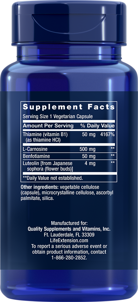 Serving Size 1 vegetarian capsule Thiamine (vitamin B1) (as thiamine HCl) 50 mg L-Carnosine 500 mg Benfotiamine 50 mg Luteolin [from Japanese sophora (flower buds)] 4 mg Other ingredients: vegetable cellulose (capsule), microcrystalline cellulose, ascorbyl palmitate, silica. Non-GMO