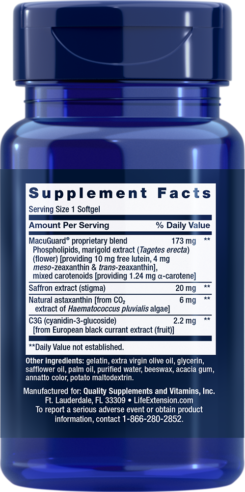 This formula also includes saffron extract. Multiple clinical studies have shown that supplementation with 20 mg of saffron helps support vision and retinal function, as measured both by advanced technical testing and on the Snellen eye chart that is commonly used by doctors to test vision.11-13