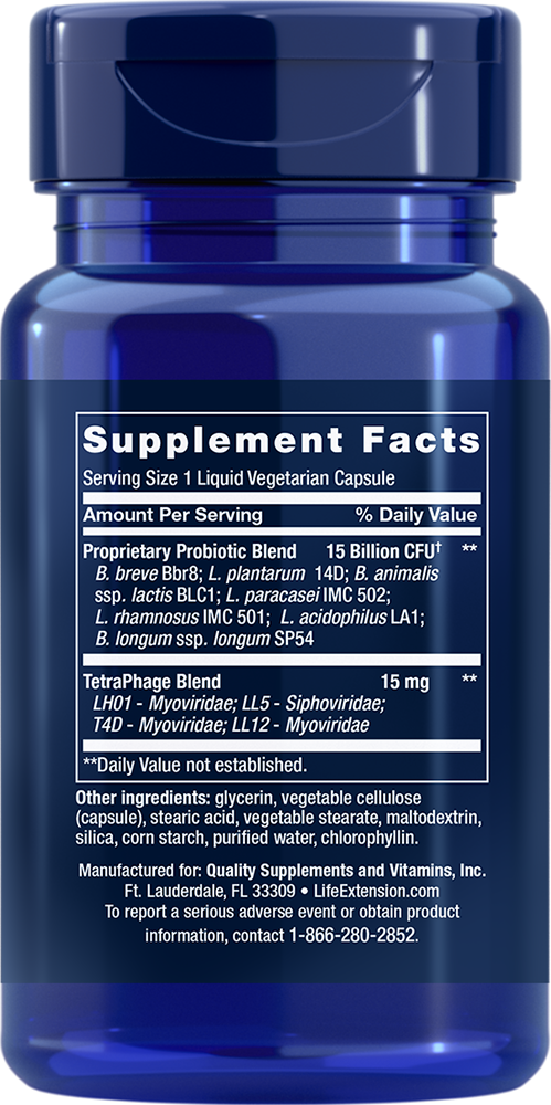 FLORASSIST® GI now delivers SEVEN probiotic strains: B. breve Bbr8; L. plantarum 14D; B. animalis ssp. lactis BLC1; L. paracasei IMC 502; L. rhamnosus IMC 501; L. acidophilus LA1; B. longum ssp. longum SP54. Together, there are 15 billion colony forming units (or CFUs) per capsule of these probiotic strains. Plus, the FLORASSIST® probiotic blend is formulated to work in synergy with the TetraPhage blend.7