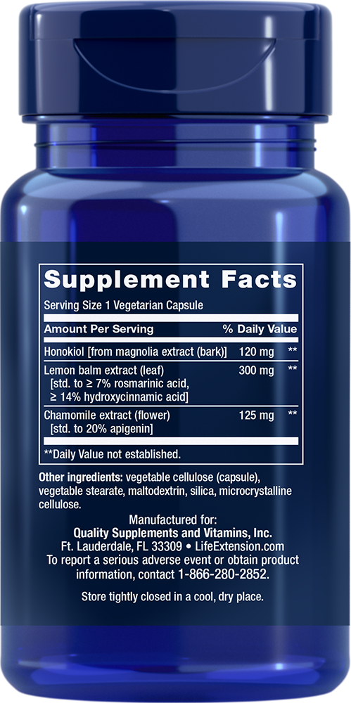 Serving Size 1 vegetarian capsule Honokiol [from magnolia extract (bark)] 120 mg Lemon balm extract (leaf) [std. to >7% rosmarinic acid, >14% hydroxycinnamic acid] 300 mg Chamomile extract (flower) [std. to 20% apigenin] 125 mg Other ingredients: vegetable cellulose (capsule), vegetable stearate, maltodextrin, silica, microcrystalline cellulose. Non-GMO Do not consume alcohol, drive or operate machinery after taking this product.
