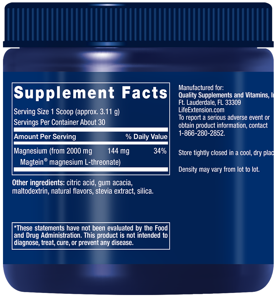 Serving Size 1 scoop (approx. 3.11 g) Servings Per Container about 30 Magnesium (from 2000 mg Magtein™ magnesium L-threonate) 144 mg Other ingredients: citric acid, gum acacia, maltodextrin,