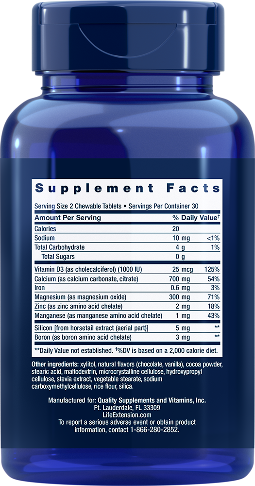 We’ve formulated this new Bone Restore supplement as a delicious chocolate chewable because we know that it can be hard to keep up with a comprehensive supplement regimen. Plus, there’s all kinds of reasons why you’d rather eat chocolate than another plain calcium supplement. Just two chewable tablets a day helps promote strong, healthy bones and won’t spoil your diet.