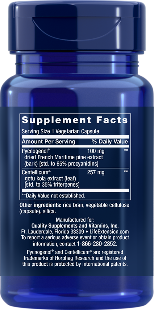 Serving Size 1 vegetarian capsule Pycnogenol® dried French Maritime pine extract (bark) [std. to 65% procyanidins] 100 mg Centellicum® gotu kola extract (leaf) [std. to 35% triterpenes] 257 mg Other ingredients: rice bran, vegetable cellulose (capsule), silica. Non-GMO Pycnogenol® and Centellicum® are registered trademarks of Horphag Research and the use of this product is protected by international patents.