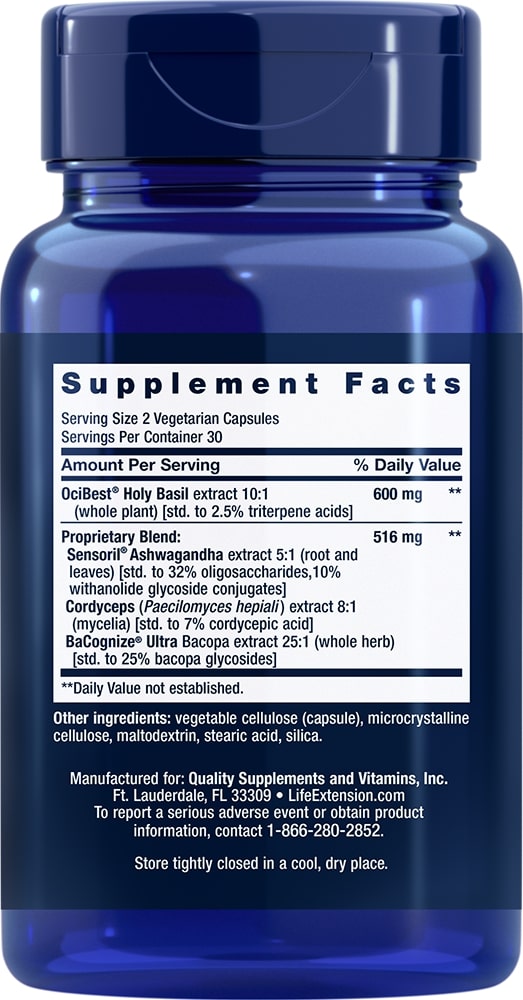 Serving Size 2 vegetarian capsules Servings Per Container 30 OciBest® Holy Basil extract 10:1 (whole plant) [std. to 2.5% triterpene acids] 600 mg Proprietary Blend: 516 mg Sensoril® Ashwagandha extract 5:1 (root and leaves) [std. to 32% oligosaccharides, 10% withanolide glycoside conjugates] Cordyceps (Paecilomyces hepiali) extract 8:1 (mycelia) [std. to 7% cordycepic acid] BaCognize® Ultra Bacopa extract 25:1 (whole herb) [std. to 25% bacopa glycosides] Other ingredients: vegetable cellulose (capsule), microcrystalline cellulose, maltodextrin, stearic acid, silica. Non-GMO BACOGNIZE® ULTRA is a registered trademark of Verdure Sciences, Inc.