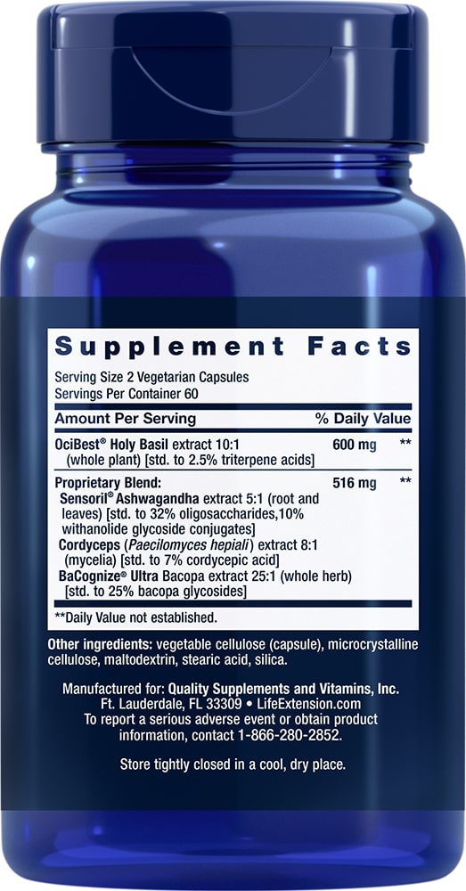 Serving Size 2 vegetarian capsules Servings Per Container 60 OciBest® Holy Basil extract 10:1 (whole plant) [std. to 2.5% triterpene acids] 600 mg Proprietary Blend: 516 mg Sensoril® Ashwagandha extract 5:1 (root and leaves) [std. to 32% oligosaccharides, 10% withanolide glycoside conjugates] Cordyceps (Paecilomyces hepiali) extract 8:1 (mycelia) [std. to 7% cordycepic acid] BaCognize® Ultra Bacopa extract 25:1 (whole herb) [std. to 25% bacopa glycosides] Other ingredients: vegetable cellulose (capsule), microcrystalline cellulose, maltodextrin, stearic acid, silica. Non-GMO BACOGNIZE® ULTRA is a registered trademark of Verdure Sciences, Inc.